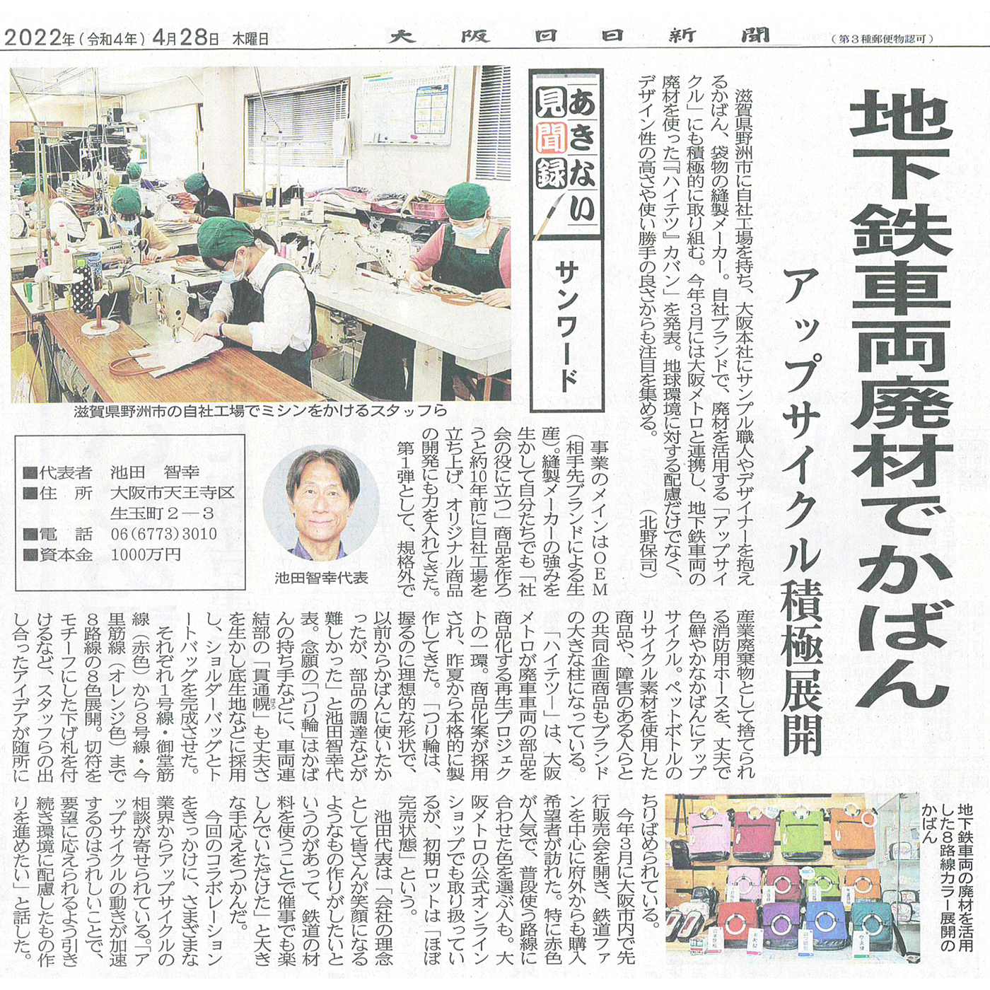 2022.04.28 メディア 大阪日日新聞に掲載されました 2022年4月28日発刊の大阪日日新聞にて、弊社オリジナルブランドの取り組みやものづくりへの思いについて掲載していただきました。 一覧へ戻る