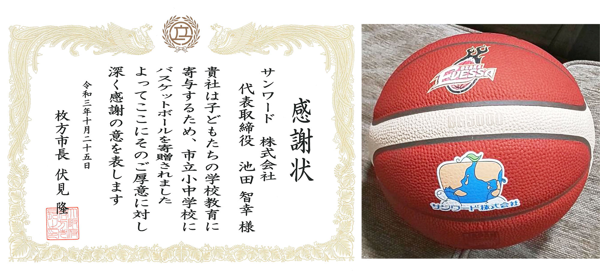 プロバスケットボールチーム「大阪エヴェッサ」様の“子ども達が大好きなバスケットボールに思いっきりチャレンジできる環境を整えたい”との思いに賛同し、枚方市立の小中学校へバスケットボール18球の寄贈をいたしました。