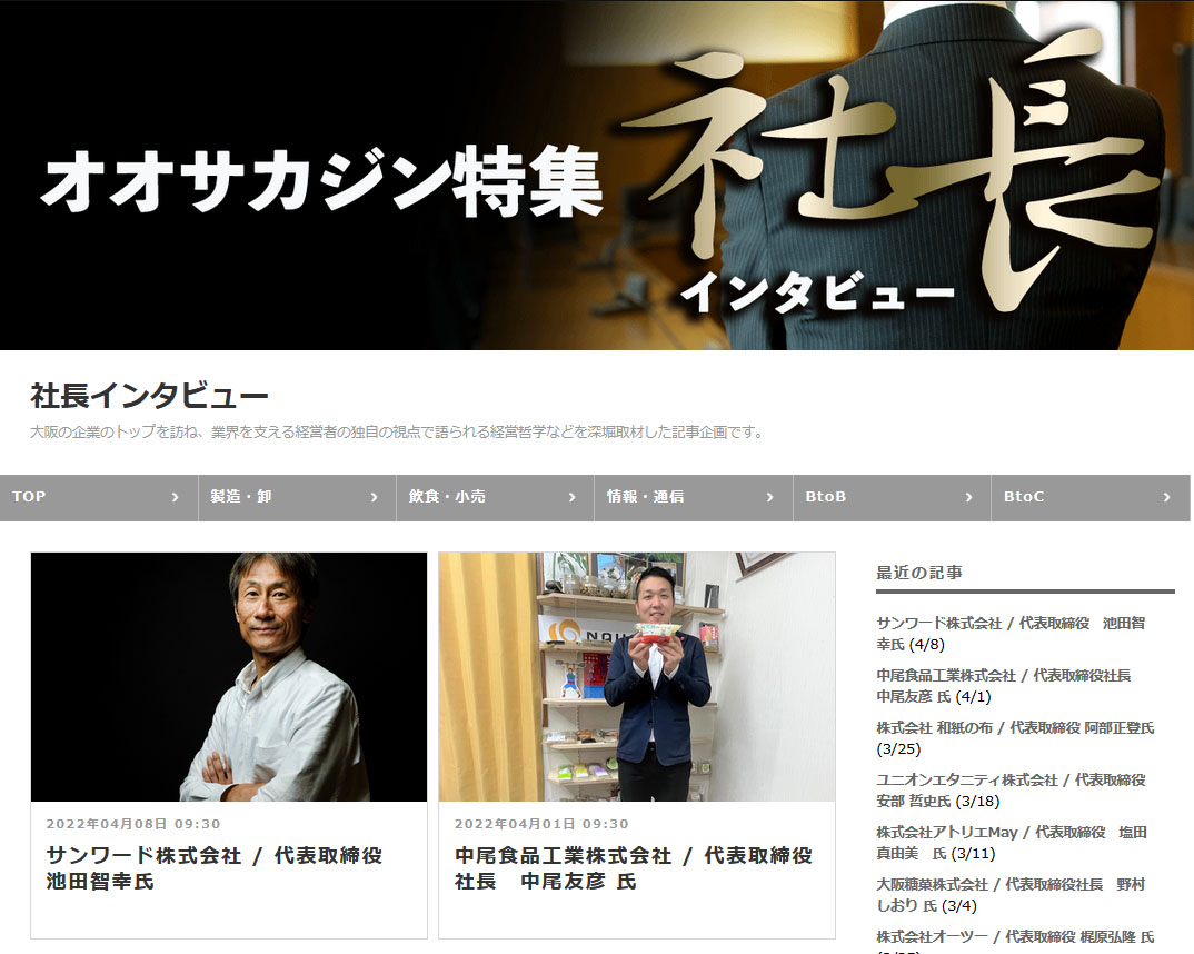 2022.04.08 メディア 「オオサカジン」に掲載されました 弊社代表取締役池田智幸のインタビュー記事が、大阪市を中心とした地域ブログポータルサイト「オオサカジン」に掲載されました。 ▶掲載ページこちら◀ 一覧へ戻る