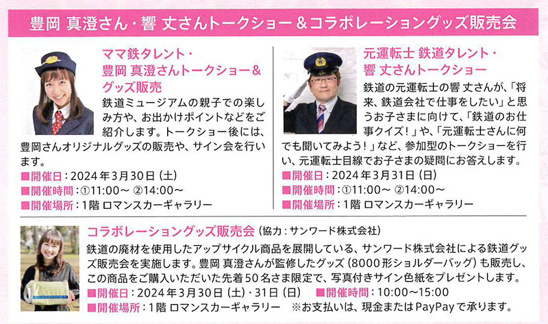 イベントではママ鉄タレント「豊岡真澄さん」、元鉄道運転士タレント「響丈さん」のトークショーも開催されますので、ぜひこの機会にロマンスカーミュージアムへお越しください。