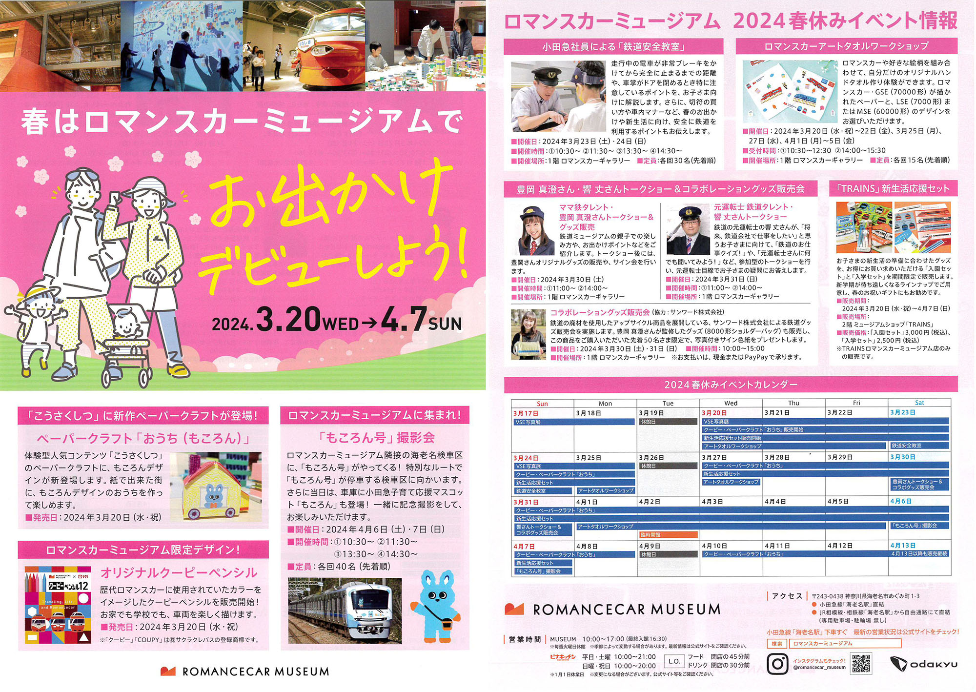 3月20日(水・祝)より小田急電鉄株式会社が運営するロマンスカーミュージアムにて開催されている、電車でのお出かけを応援するイベント「春はロマンスカーミュージアムでお出かけデビューしよう!」に3月30日(土)・31日(日)の2日間出店いたします。