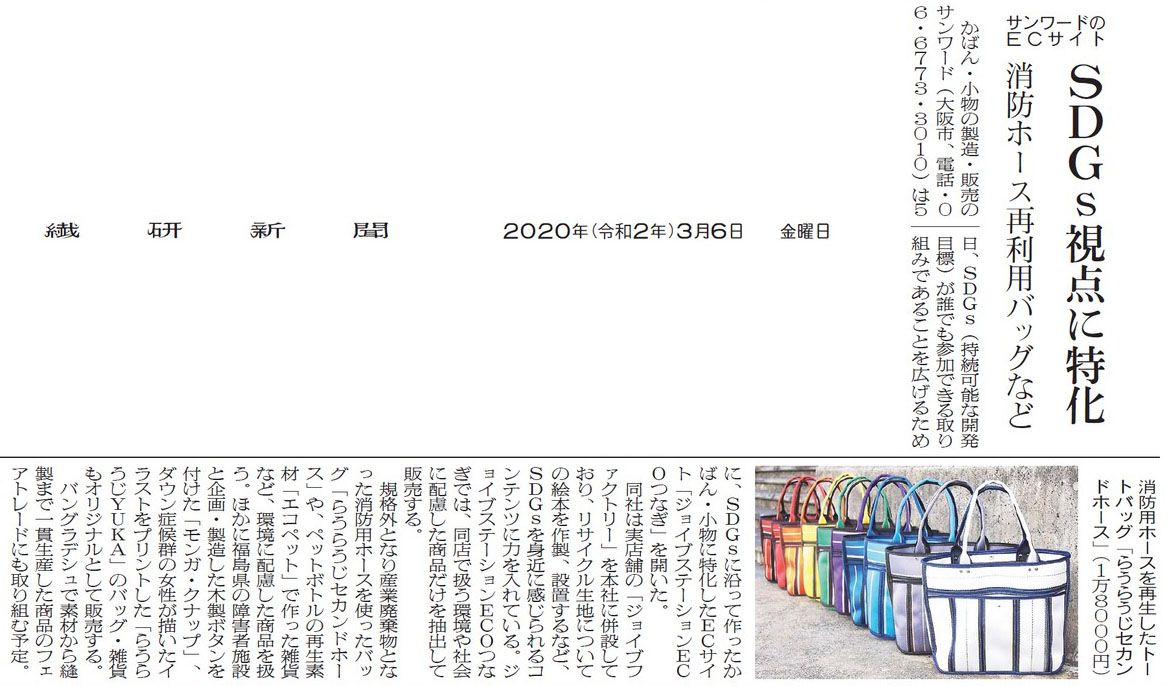 かばん・小物の製造・販売を行う弊社は、SDGs(持続可能な開発目標)が誰でも参加できる取り組みであることを広げるため、消防用ホースを再生したトートバッグにSDGsに沿って作ったかばん・小物に特化したECサイト「ジョイブステーションecoつなぎ」を開きました。
