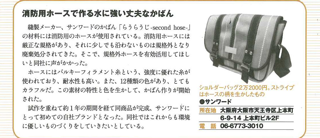 弊社のかばん「らうらうじ-second hose-」の材料には消防用のホースが使用されています。ホースにはバルキーフィラメント糸という、強度に優れたいとが使われており、耐水性も高いです。また、12種類の色があり、とてもカラフルです。この素材の特性と色を生かしてカバン作りを開始しました。
