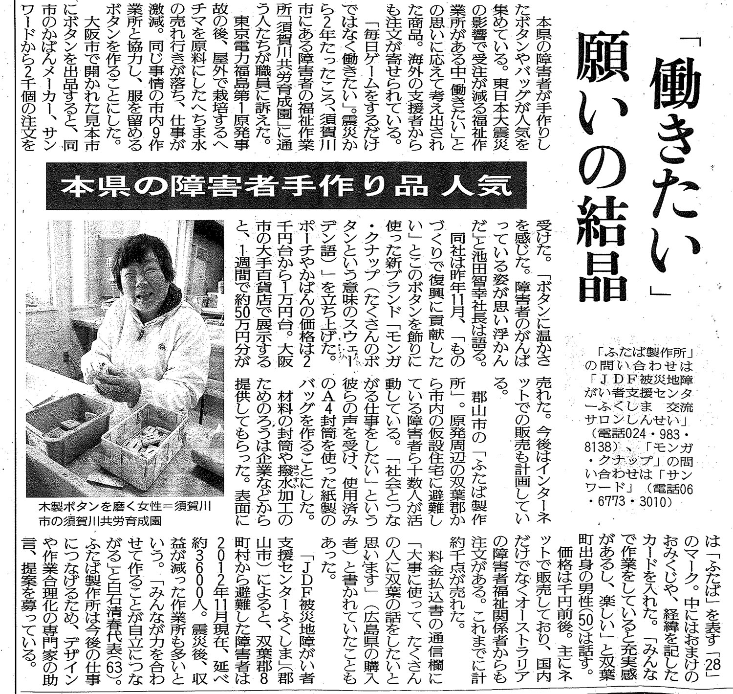 弊社が昨年11月に「ものづくりで復興に貢献したい」と、福島県の障害者が手作りしたボタンを飾りに使った新ブランド「モンガ・クナップ」が紹介されました。