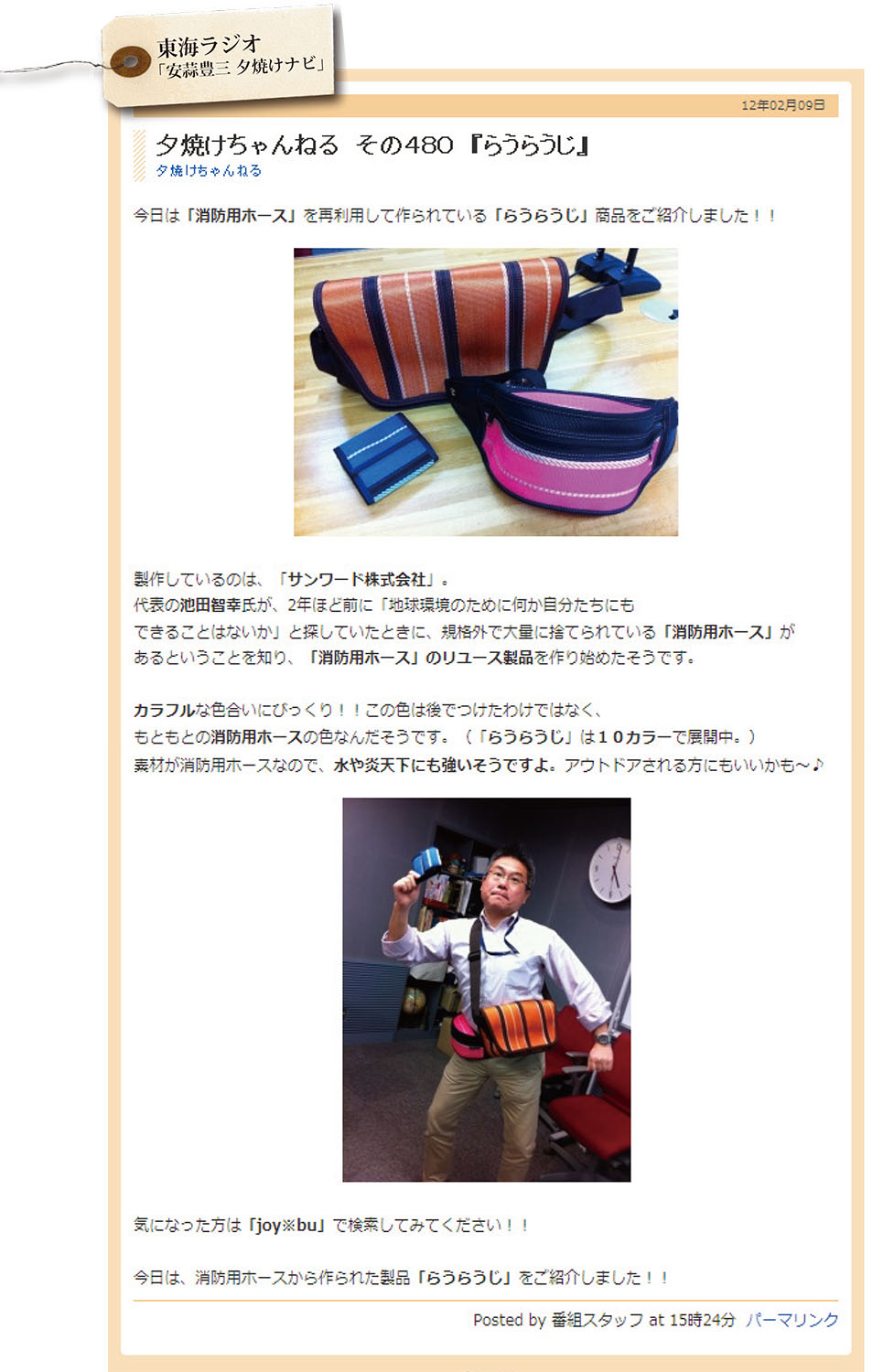 東海ラジオ「安蒜豊三 夕焼けナビ」にて、「らうらうじ-second hose-」の商品をご紹介いただきました。