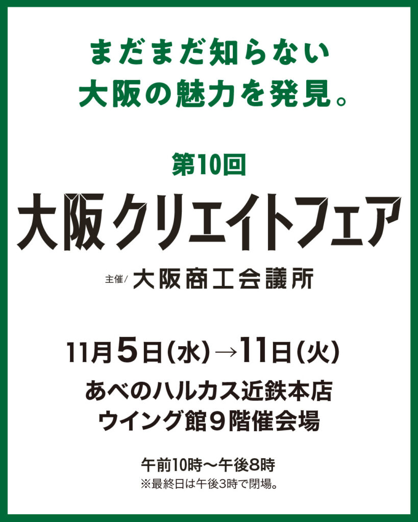 11月5(水)より、近鉄百貨店 あべのハルカス近鉄本店 9階催会場にて開催の「第10回 大阪クリエイトフェア」に出店致します。