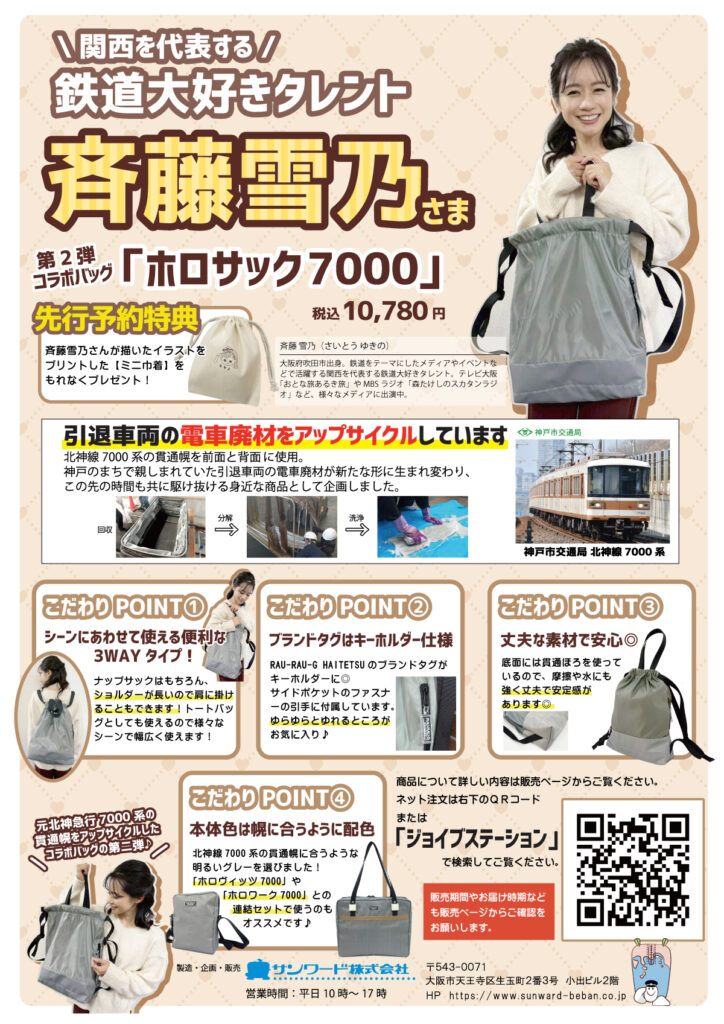 本日1月9日(金)より、関西を代表する鉄道大好きタレント斉藤雪乃さんとのコラボバッグ第2弾「ホロサック7000」の予約販売を開始いたします。