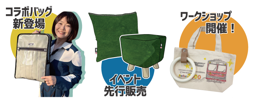 神戸電鉄3000系の座席シート生地をアップサイクルした「モケットクッション」、「モケットミニスツール」をイベントで先行販売致します。